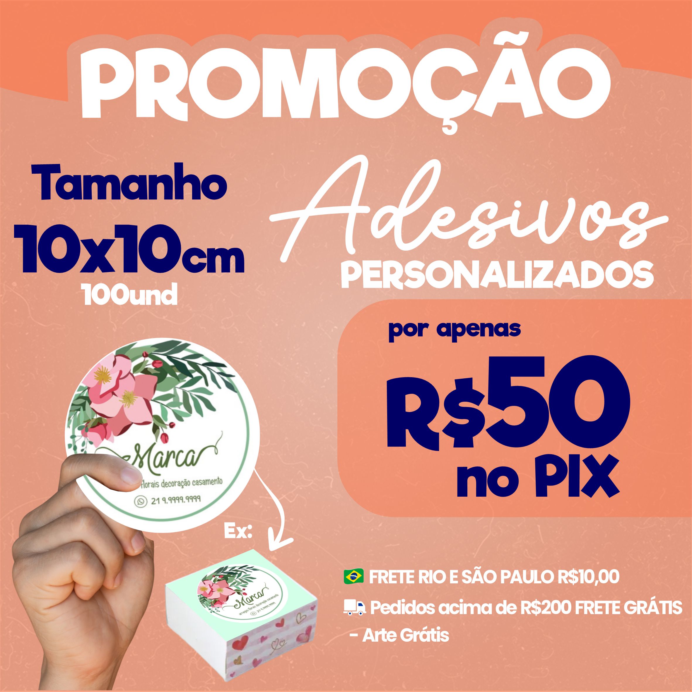 100 Adesivos vinil 10x10 personalizado a prova dágua