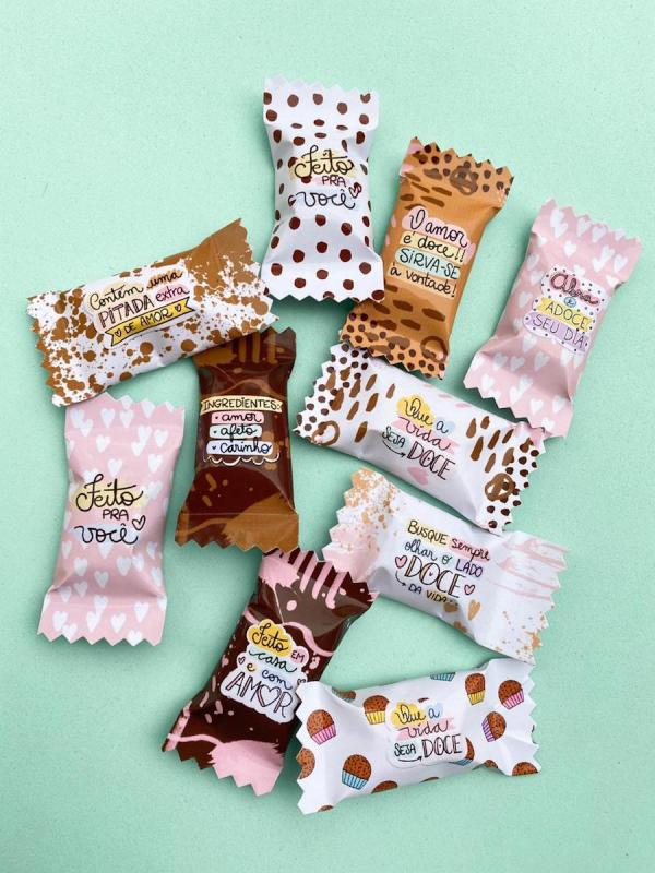 Balas Personalizadas embaladas com adesivo vinil acabamento picote nas bordas facilitando a abertura da bala.