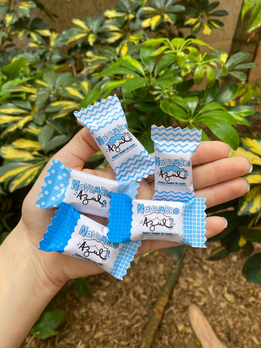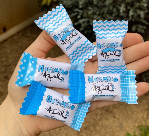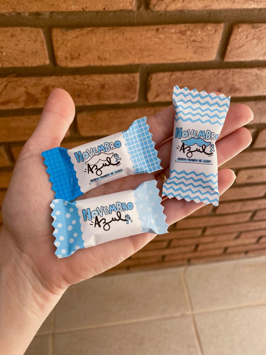 Balas Personalizadas embaladas com adesivo vinil acabamento picote nas bordas facilitando a abertura da bala.