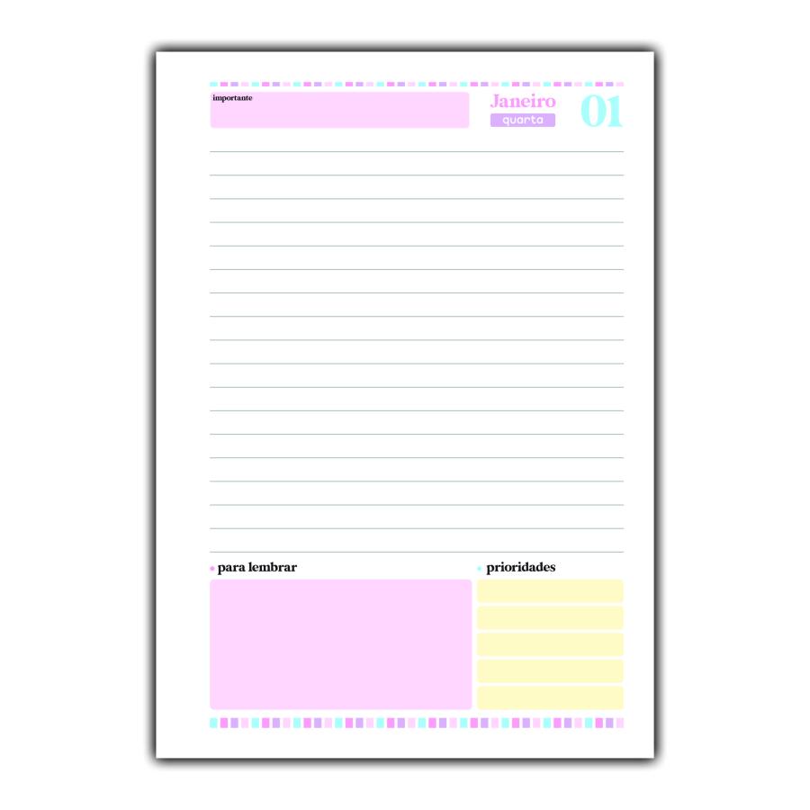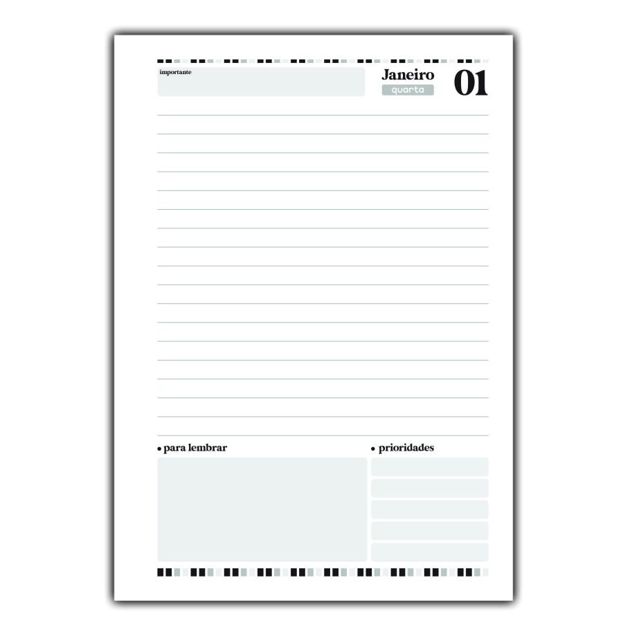 No início de cada mês inserimos uma página com o planejamento diário, assim facilitando visualmente as suas anotações.