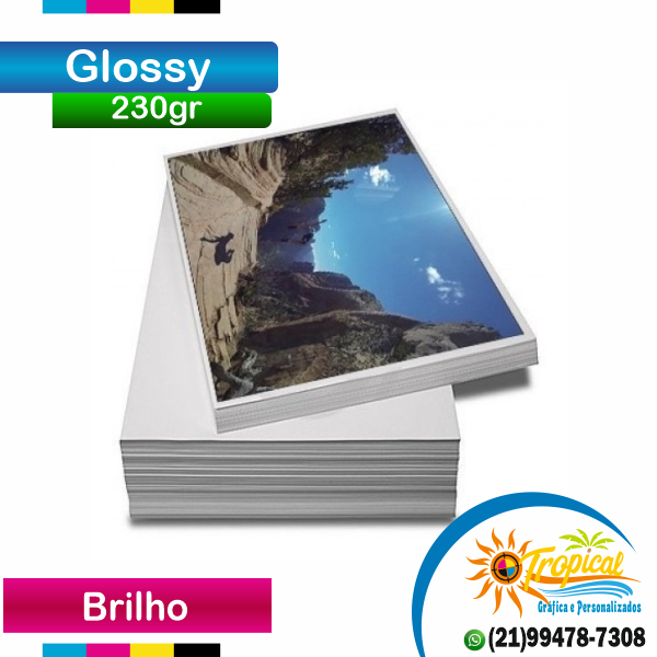 O Papel Glossy é o papel que todos conhecem como brilhante, é o mais comum de se encontrar. O Papel Glossy tem um brilho intenso, a impressão é mais atraente e chamativa. Pode levar mais tempo para secar do que as impressões Matte devido ao seu revestimento brilhante. Normalmente ele terá um lado para ser impresso e um lado sem revestimento. Os papéis dos tamanhos A6 - A4 - A3 e de gramatura 130,180, 200, 230g são os mais comuns que encontramos no mercado.