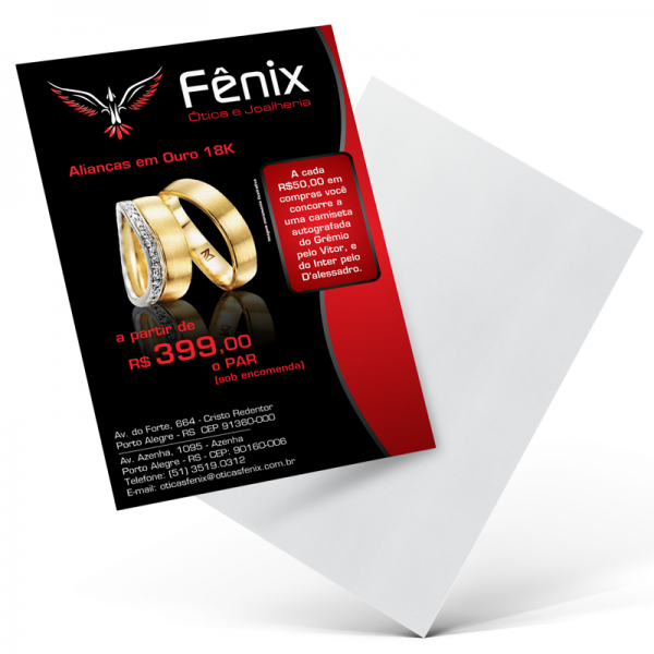 Também conhecidos como panfletos ou flyers, os Folhetos são materiais publicitários que divulgam uma ideia, produto ou serviço. São uma excelente maneira de apresentar a sua marca ao público e persuadi-lo a se tornar cliente.